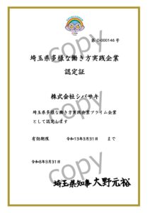 当社は、埼玉県が認定する「多様な働き方実践企業認定制度」において、最高位である「プライム」に認定されています。